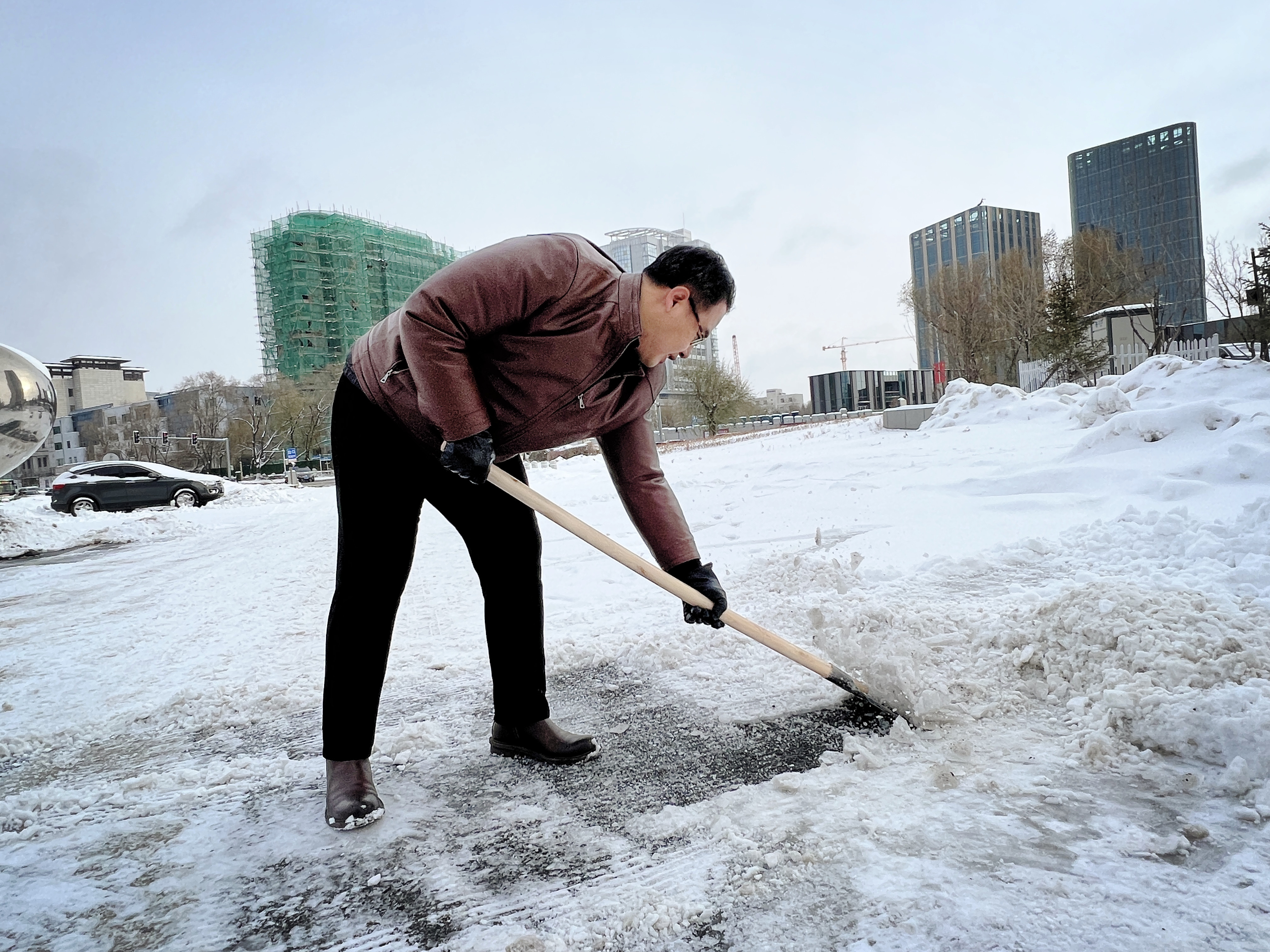 党员们在观测了楼前路面情况后,决定将清雪重点放在停车场出车路线,抄起锹铲干了起来。