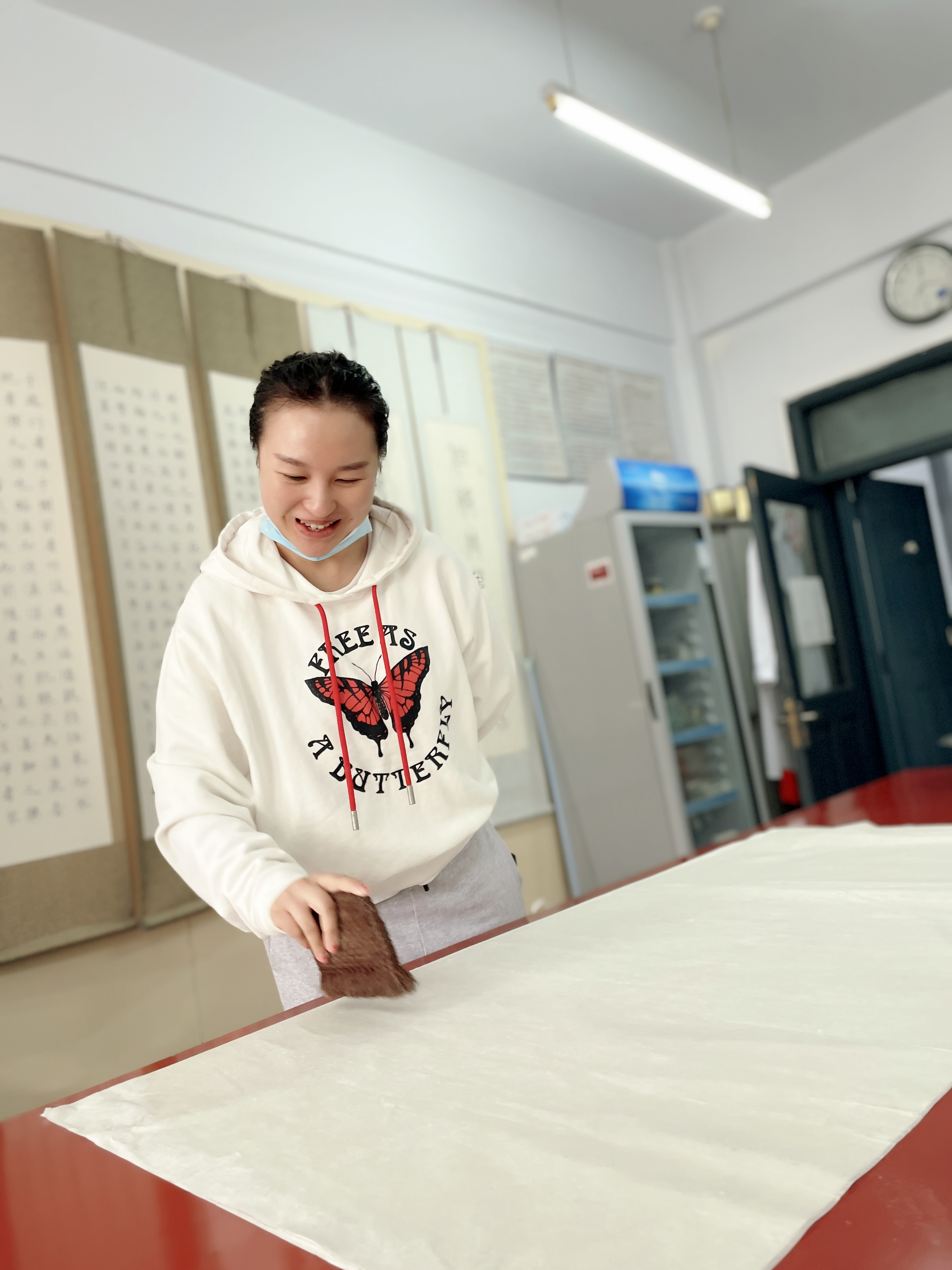 姜晓东在教培训人员分辨清楚宣纸的正反面之后,将宣纸反面向上辅在干净的画案上,用棕刷沾水后轻甩使水花均匀散布在宣纸表面,稍提起宣纸一边将水分整理均匀,平整贴附在画案上,之后用排笔少量蘸取提前一天熬制的稀浆糊在宣纸中心部位以“米”字形状均匀向宣纸周围刷浆、四面扩散。遇到出现死褶的情况时,第一时间用排刷清褶。