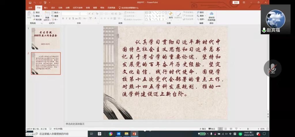 赵宾福做了点评并进行了总结。赵宾福讲到,时值疫情防控的重要时期,学院要抓好疫情防控和线上教学两条线的工作,确保各项工作不出问题。目前国家和学校都对考古学科倾注了很大的心血,肉视频