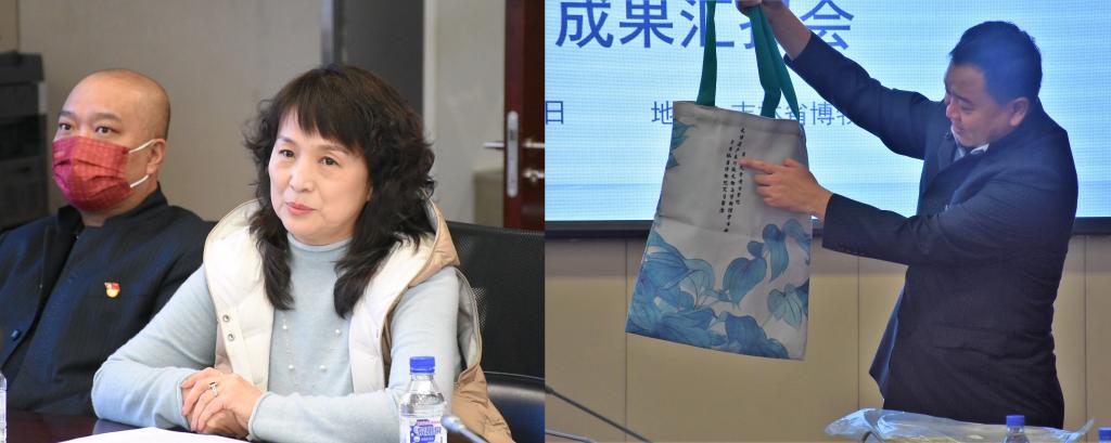 文博遗产系师生赠送本次实习期间的学生文创设计成果——张大千《拟宋徽宗照殿红牡丹图》帆布包,以及吉林省博物院的日历与暖手宝,得到大家的热烈欢迎。同时杨主任也表达了未来愿与吉大文博继续在文创设计方面展开深入合作的畅想。