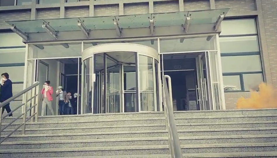 讲座结束后,保卫处在匡亚明楼二楼门前燃放了烟雾弹,随后警报响起,全体师生在引导员的指引下,用毛巾捂住口鼻迅速从各个安全出口疏散撤离。全部人员撤离到安全区域后,在匡亚明楼门前空地设置模拟火情,董立明为大家讲解了灭火器的使用方法及注意事项,并指导师生操作灭火器对初起火灾进行扑救。
