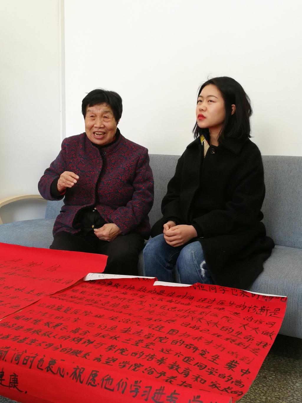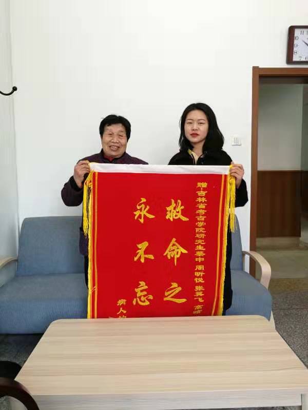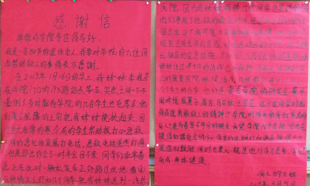 学生:2018级硕士生张翼飞、周昕悦、高晗、王莹莹、马庆林和2018届本科毕业生蔡中等6名同学发现这一情况后,毫不犹豫地将老人妹妹搀扶起来。即便当天天气非常寒冷,学生们有的联系家属,有的拨打120求助电话,但由于救护车出急诊,当时无法及时赶过来。连续打几辆出租车见这种情况都没有载他们,在努力招手求救后终于有私家车停了下来,几个同学合力把老人抬上车,送到医院。后来经医院诊断,老人得的是脑出血,正是由于他们的及时救助,才为抢救赢得了宝贵的时间。几经周转,老人打听到几个同学的名字,趁学校刚刚开学之际,老人妹妹也稍有好转的情况下,特意来学院对同学们及时施救的义举表达感谢。
