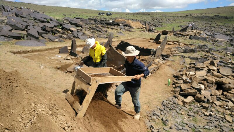 边疆考古研究中心曾与蒙古国立大学人文学院人类学与考古学系合作,对图音河中上游地区的数处石构墓群开展过初步的考古调查。本次发掘工作主要针对曾经调查过的达黑拉吐地点和新发现的朝伦昂古奇特地点的石板墓群展开。其中在前一地点发掘小型石板墓5座,有3座保存完整,2座早期被扰;在后一地点发掘大中型石板墓4座,均被早期扰乱,有1座又被现代再次盗掘。墓葬平面形状均系长方形,多呈东北—西南向,沿山坡的水平方向设置。地表挖有浅穴,浅穴的四壁立砌大小不一的石板构成石围,一般墓葬的北壁与南壁石墙长度要大于东壁与西壁石墙的长度,且墓葬四角(即墓葬北壁与南壁的两端)所立石板要比其它部位的立砌石板更为高大。从保存较好的墓葬看,墓内堆积均分为两层,第一层主要为大小不一的石块堆积而成,缝隙间有灰黄色淤土。第二层为一薄层黄灰色沙土。其下墓框中间部位为圆角长方形或长椭圆形墓坑,墓坑深10-50厘米不等。墓坑口部覆盖数量多少不一的石盖板。未被扰乱的人骨皆仰身直肢,头向东或东北。9座墓中均发现有殉牲,未被扰动的殉葬羊头或牛头均置于墓主人头端左侧二层台上,而羊或牛的肩胛骨多置于人的两腿之间。墓内随葬的人工制品较少,发现有少量陶器残片、骨镳、玛瑙珠、砺石等。陶器器形可辨者有鬲、筒腹圈足罐、敛口弧腹平底罐等,有两件陶罐基本可复原。