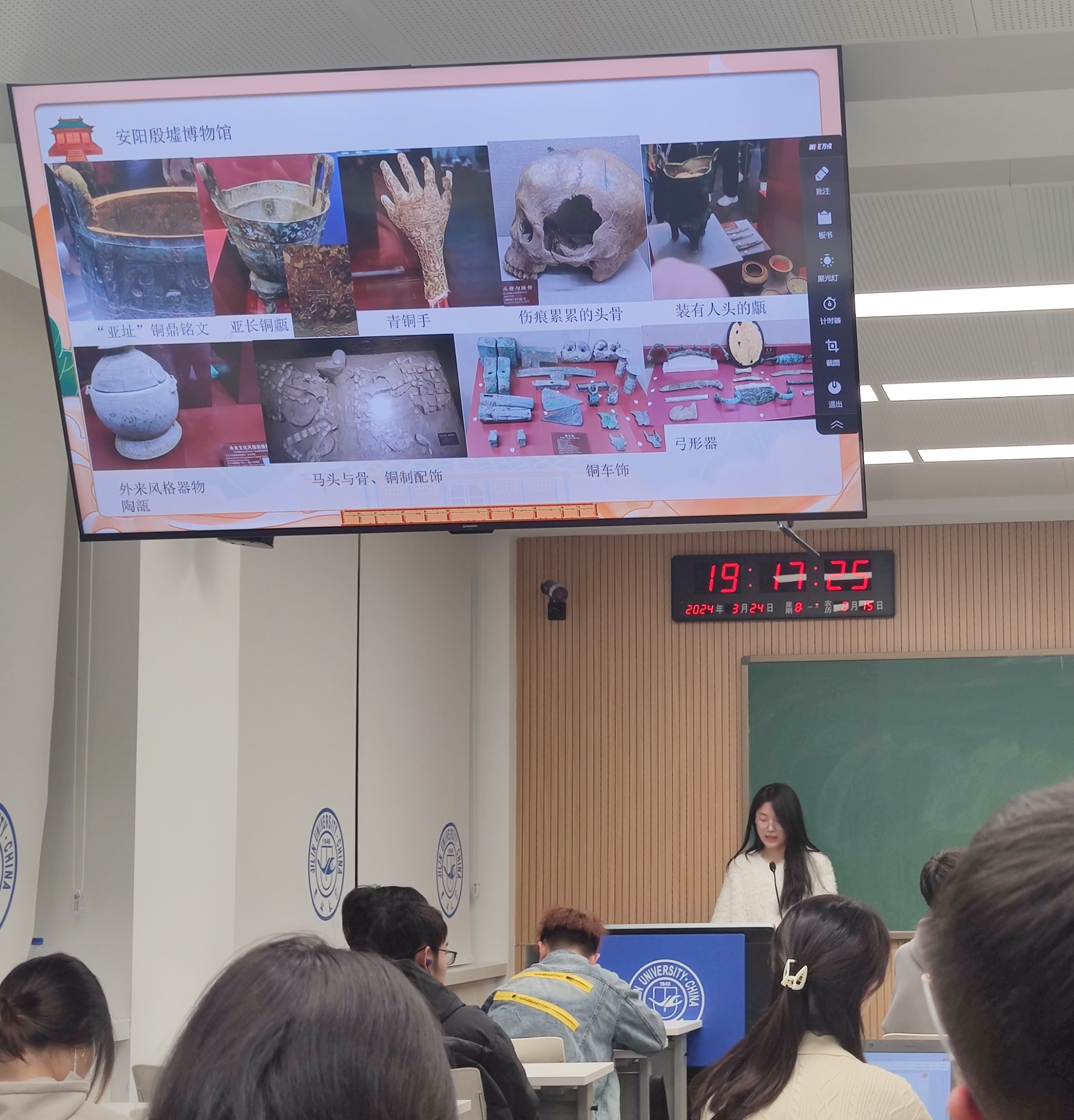 张风怡、李盈玉两位同学分别就古文字实习的上半程和下半程向大家作详细介绍。她们将古文字学专业历时20天,辗转河南、陕西、山西三省,历经郑州、安阳、西安、宝鸡、运城、太原六个城市的实习经历娓娓道来。在此期间,他们不仅到各大博物馆与考古工作站进行了调研学习,还与考古、文博专业的同学们汇合,交叉学习、分享经验。