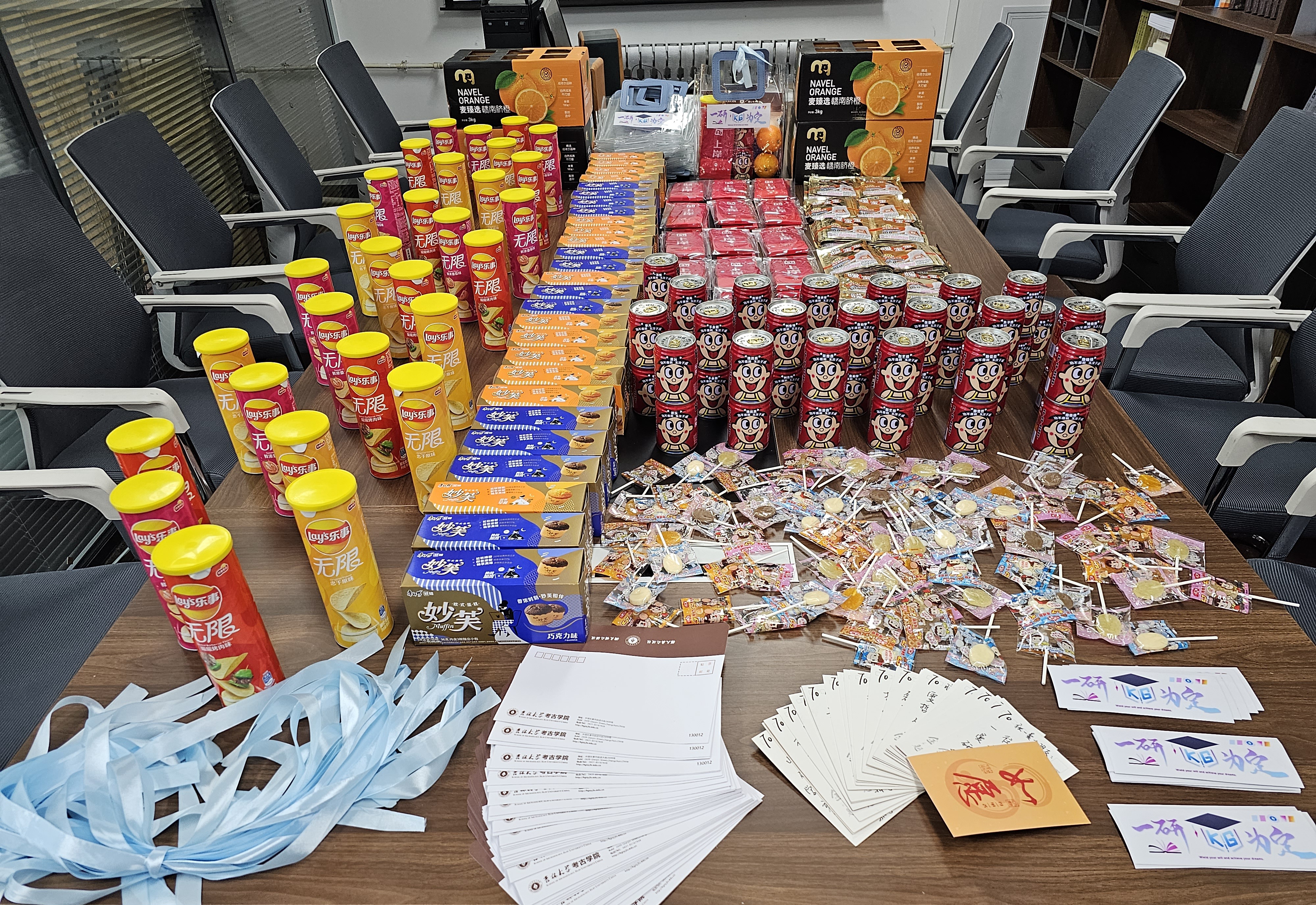 考研福袋中的每样物品都是精心准备的,承载着学院对学子们的浓浓关爱和深深祝福。包含老师亲笔书写的明信片,“一战成硕”考试专用袋,定制“牛”气冲天、一“旺”到底的旺仔牛奶,给“足”力量的上岸红袜,温暖备战的御寒暖贴、“棒”上有名的棒棒糖、“乐事”无限的薯片、心想事“橙”的橙子、“妙”笔生花的妙芙蛋糕。