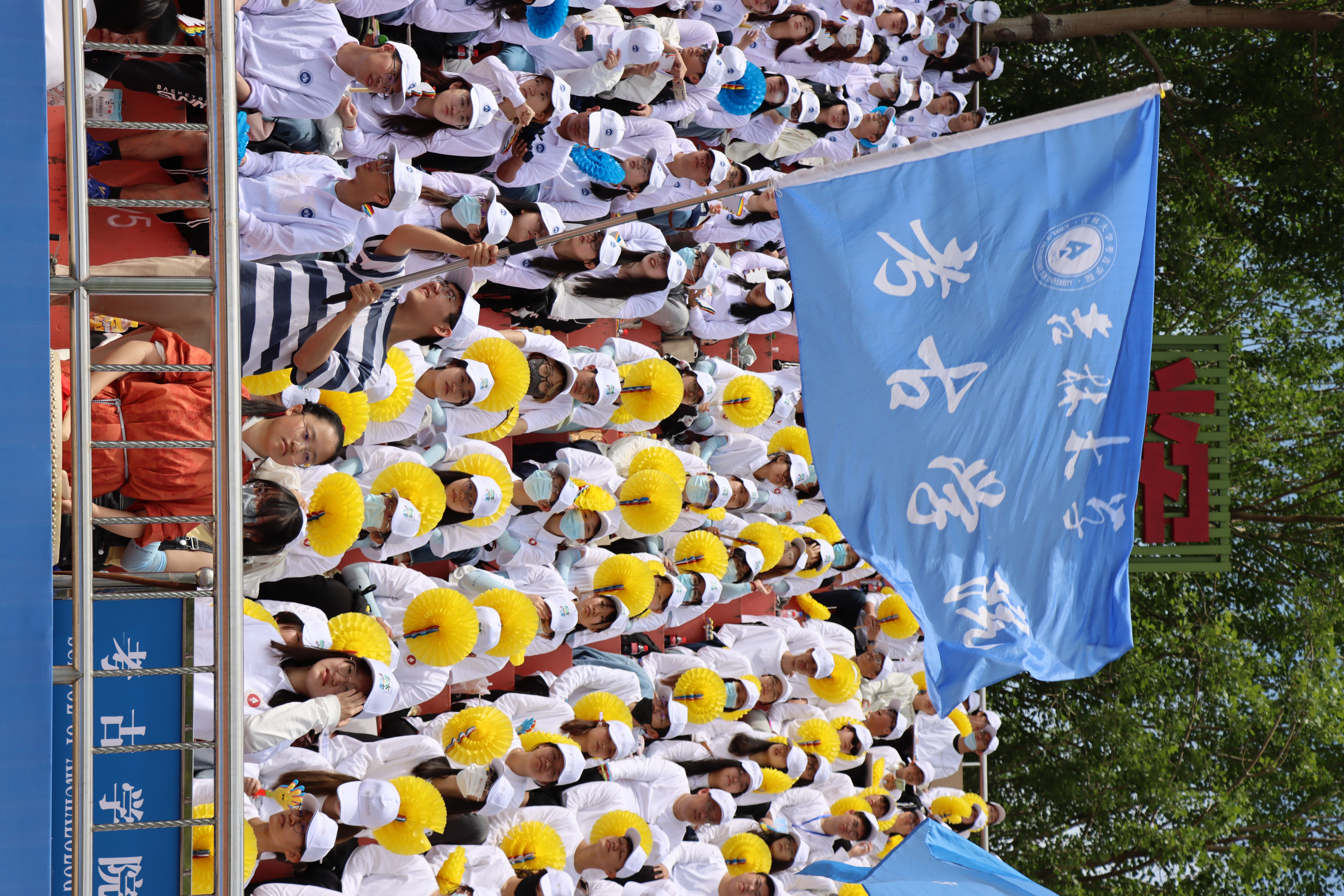 赛场之外,观众席也是考古学子展现学院风貌的重要阵地。伴随着震撼人心的鼓声,通过绚烂多彩的翻花图案和整齐响亮的学院口号,我们都是这场体育盛会的参与者。一同为赛场上的运动员们加油助威,构建赛场一角的一道亮丽风景线。