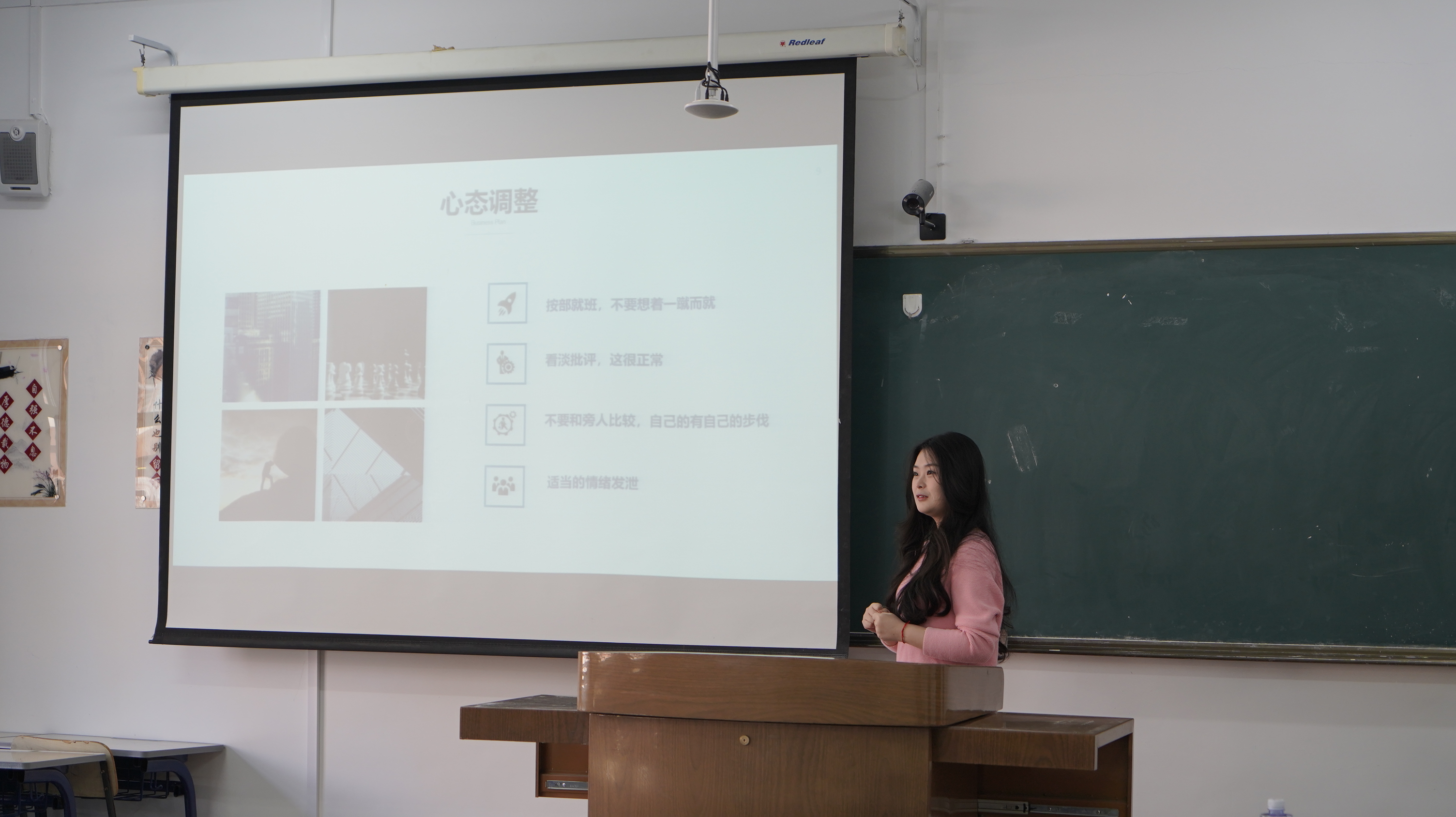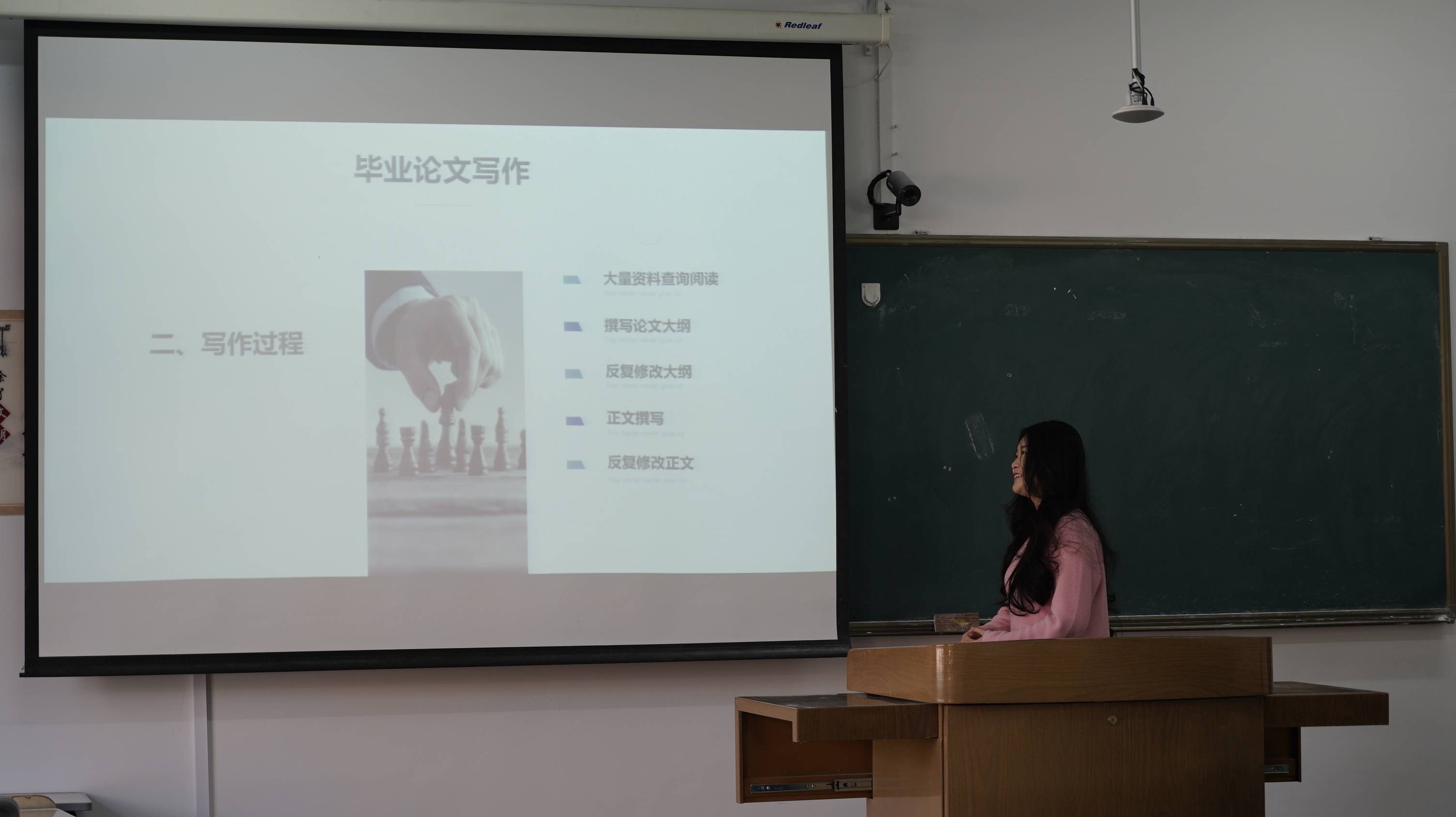 耿默兰同学以自我介绍入题,从毕业论文与学习生活两个板块进行分享。在毕业论文写作建议中,耿默兰同学首先介绍了准备工作,将其分为选题、导师选择和目标规划三步。其次将写作过程分为大量资料查阅、撰写论文大纲、反复修改大纲正文、撰写和反复修改正文五个阶段,并以自己的论文目录为例进行阐明。最后,在心态调整阶段,提出按部就班、正确看待批评、不与旁人比较和适当的情绪发泄四条建议。在第二板块学习生活中,耿默兰同学根据自身本科四年的学习经历,向同学们提出兴趣、技能、能力、活动四方面宝贵而精炼的意见,鼓励同学们做好眼前的事,最后寄语同学们:“每个人都有自己的选择,只要不后悔,就是最好的选择。”