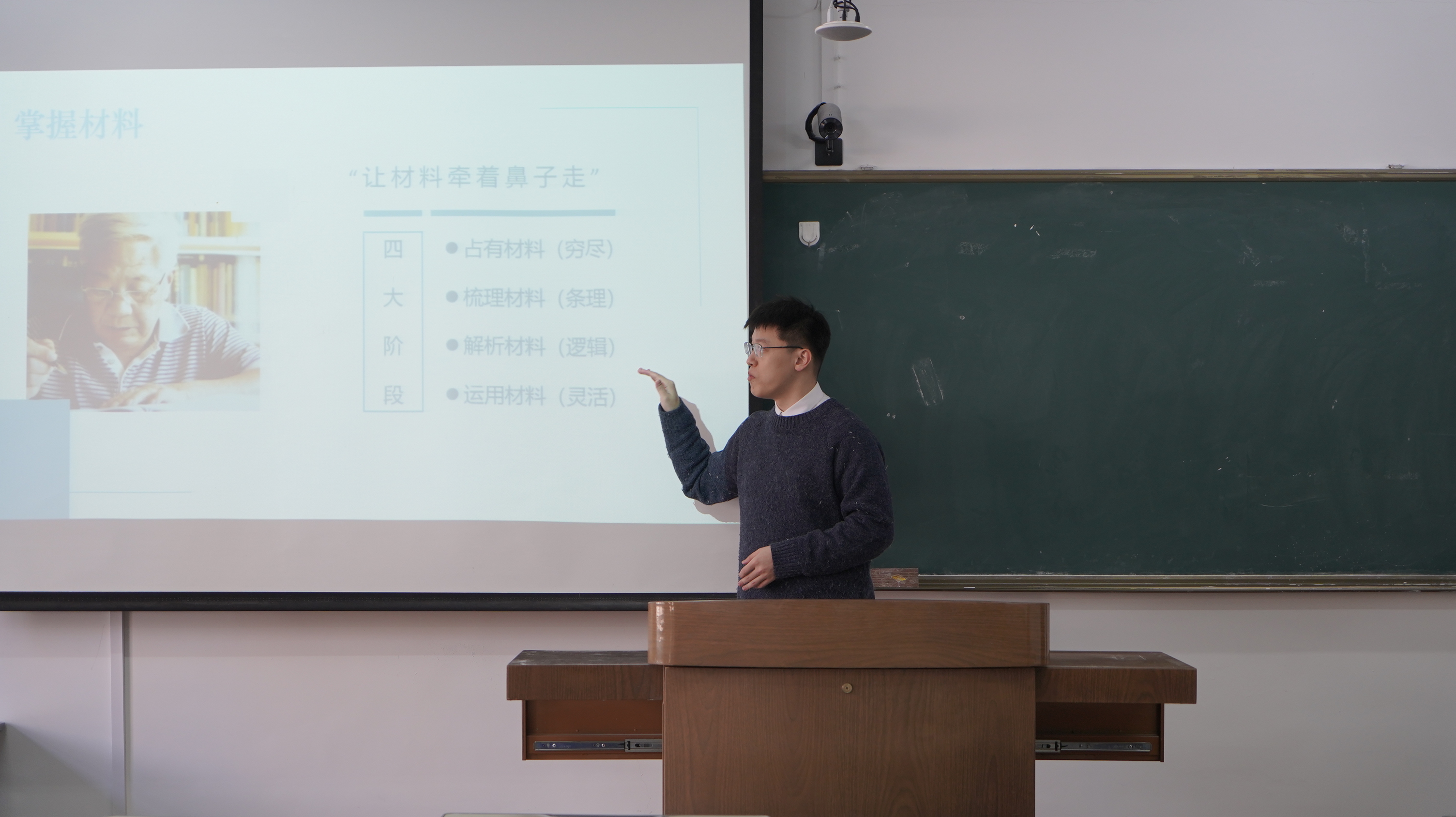 田玉峰同学以“学而思之,行以致远”的总标题开篇,从写作流程,文献综述,具体研究,论文构成和论文修改五个方面向同学们进行具体介绍。田玉峰同学首先展示了毕业论文写作的基本流程及选题分类与标准,并将标准总结为“适当”两个字。其次,引用张忠培先生的话“让材料牵着鼻子走”,提出掌握材料的四大阶段。再次,提出论文的组织基础:理论方法范式到实践,并具体阐释了理论与方法的区别。接着,将论文构成简要概括为名、文、图、表、注,提出框架、内容和逻辑三方面,并传授模仿的技巧。田玉峰同学还强调了修改的重要性,提出重复的意义与追求完美的意识。之后以自己的毕业论文为例,设身处地的对以上步骤进行举例。最后,田玉峰同学以学思笃行寄语同学,对如何度过充实的大学生活提出建议,希望大家做到学而思之、思而行之、行而再学。