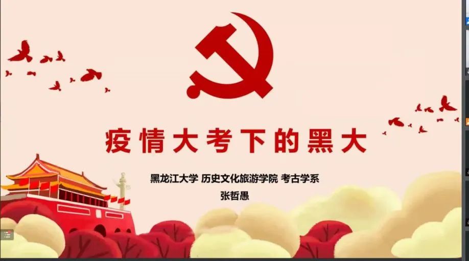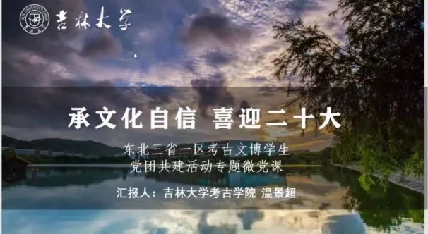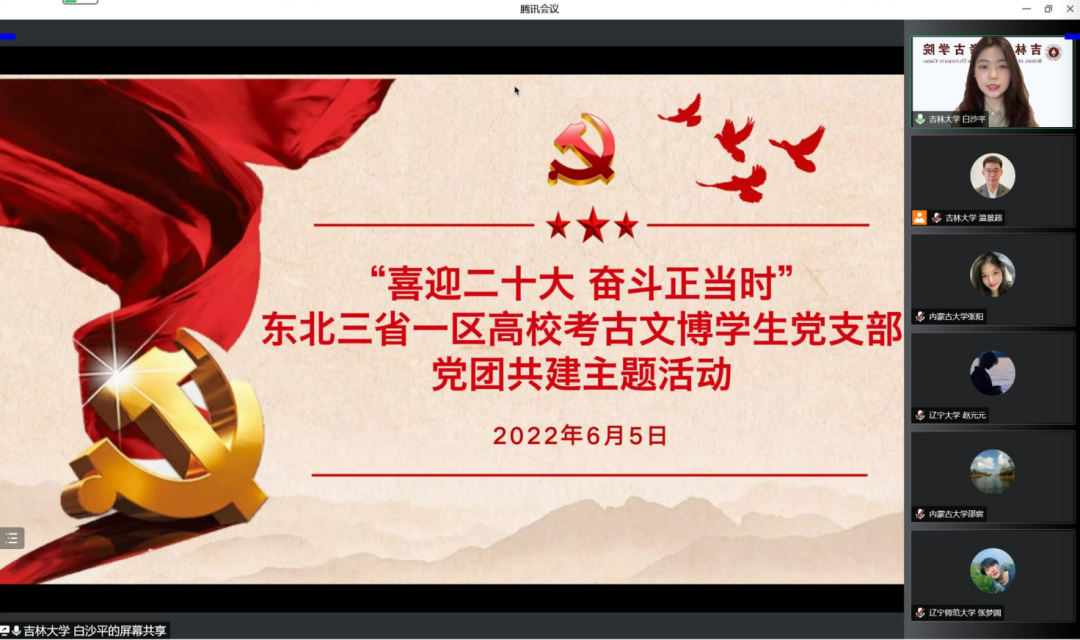 本科生党支部联合东北师范大学、黑龙江大学、辽宁大学、辽宁师范大学、内蒙古大学、内蒙古师范大学、赤峰学院,共8所东北三省一区的高校考古文博学科党团支部共同开展了“喜迎二十大 奋斗正当时”主题党团共建活动。活动以线上方式开展,来自东北地区高校考古文博单位的三十多位学院领导、教师和二百余名学生代表相聚云端,共同交流了高校考古文博学科协同发展、高校党建与学生思想教育融合发展、新时代考古青年的责任担当等议题。