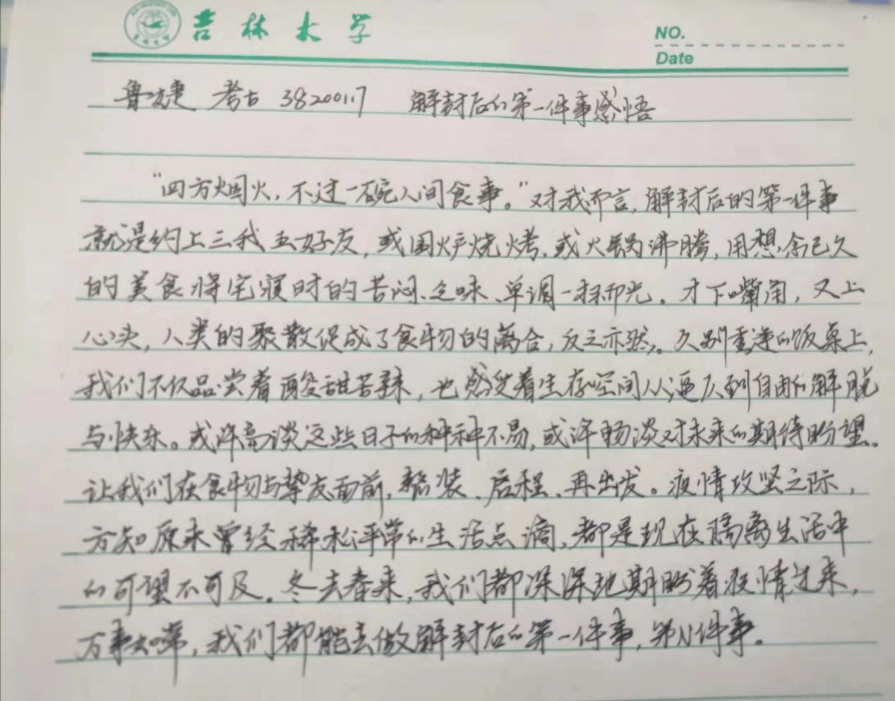 一大批优秀团员积极冲锋在前,自觉参与各种志愿服务和防疫管理工作,充分展现了新时代青年学子的责任担当精神。目前,隔离管控已有23天,每一位志愿者依然不辞辛苦,以乐观的心态迎接新一天的工作。他们用行动诠释了“人比山高,脚比路长”的吉大精神。我们相信,只要凝聚疫情防控的合力,坚定无畏前进的信念,激扬披荆斩棘的精神,那么没有一个冬天不会过去,没有一个春天不会到来。我们也相信,吉林终有吉临时,长春定复往长春。待疫情散去,我们必定以更美好的方式再遇吉大、再遇长春!