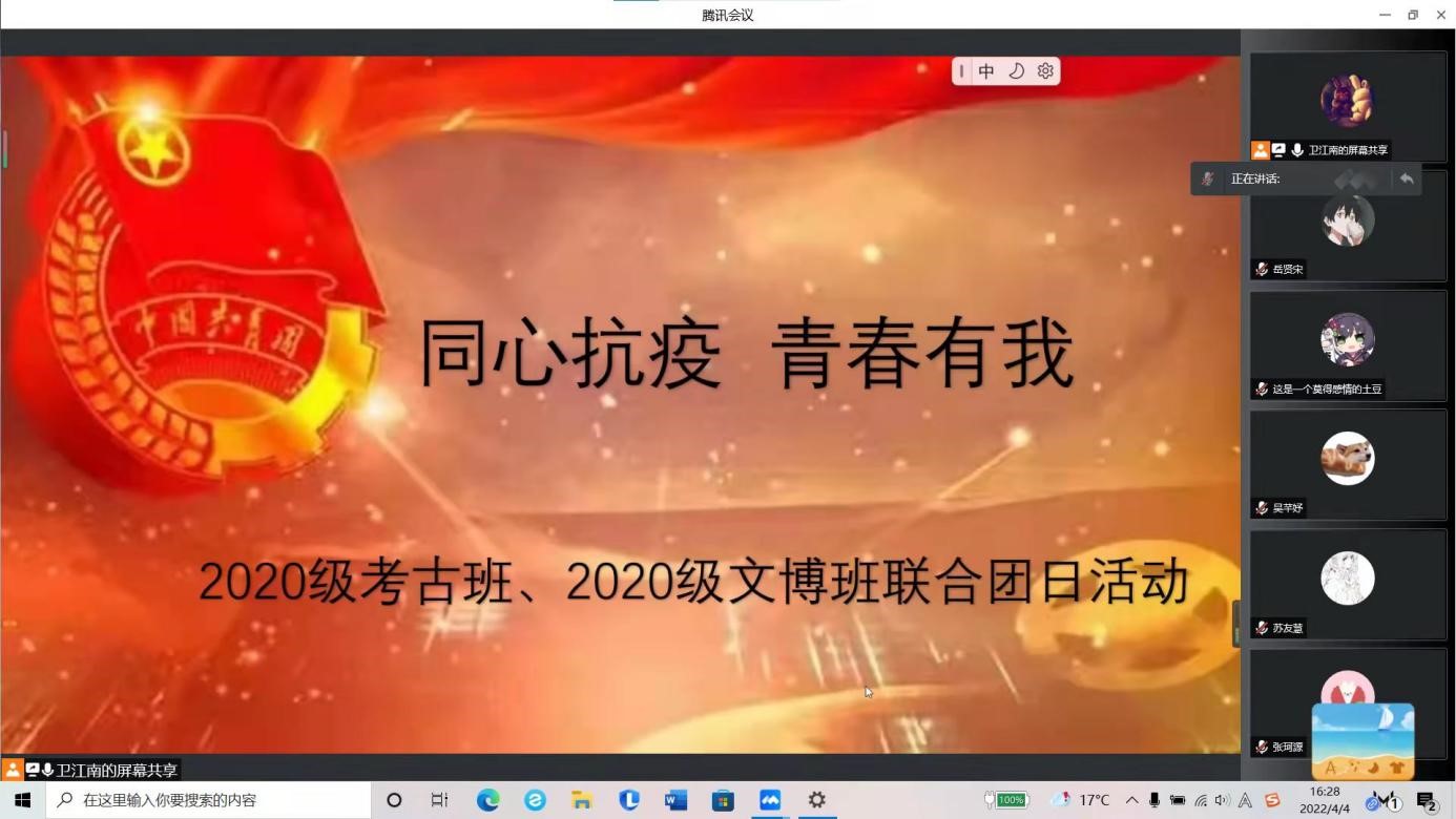 2020级考古班、文博班联合开展了“疫情防控、与我同行”线上主题团日活动。会议由考古班团支书卫江南主持,辅导员马嘉男老师和2020级全体同学参与。