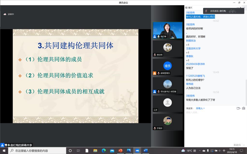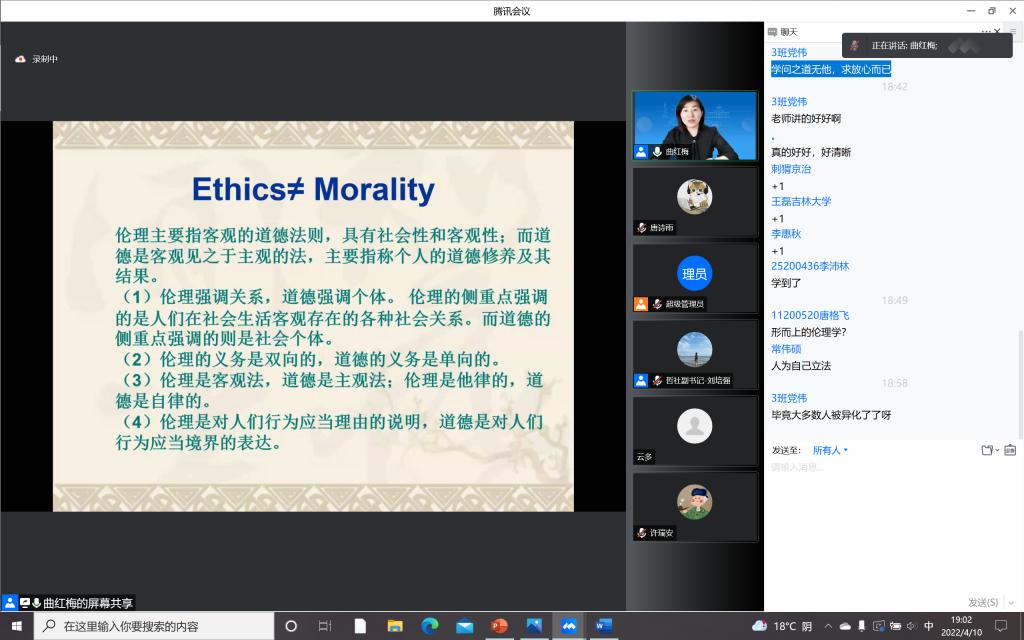 实现美好生活不仅是我们每个人的人生追求,也是党和国家的奋斗目标。此次讲座从不仅从哲学的角度启发了大家对美好生活的思考,而且从历史的角度梳理了新中国成立以来人们伦理生活的发展历程,让每一位入党积极分子对自己与时代的关联有了深刻的认识。他们纷纷表示,通过本节课学会了如何在精神与物质、个人与社会的辩证统一关系中反思生活实践,受益匪浅,希望以后能够接续传递美好的哲学精神和哲学品格。