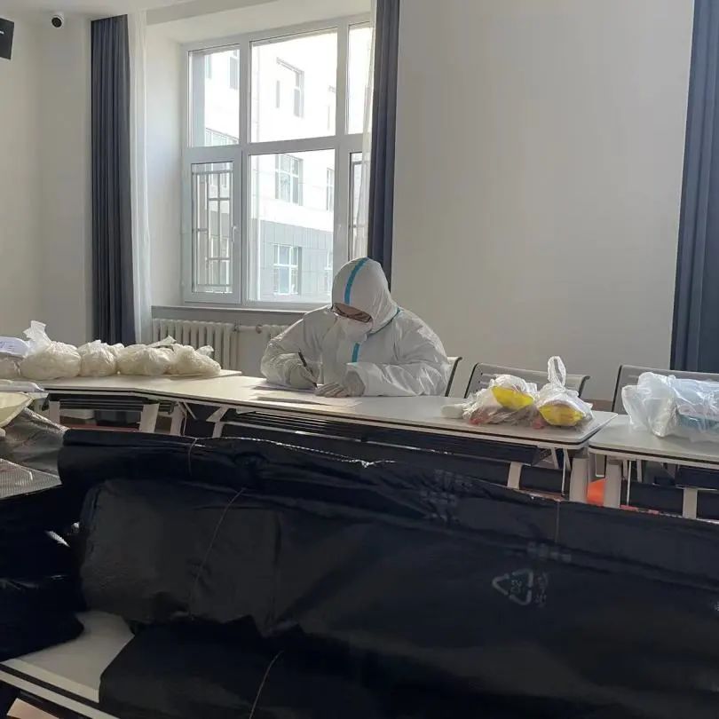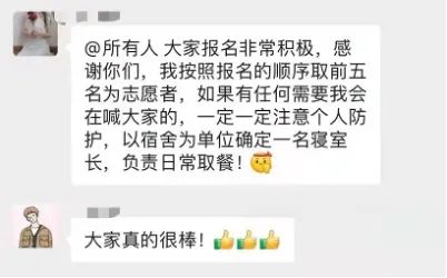 研究生秘书于歌老师分别入住北苑二公寓、北苑四公寓和北苑三公寓,师生齐心,同吃同住,与志愿者团队紧密联合,与同学们共克时艰。