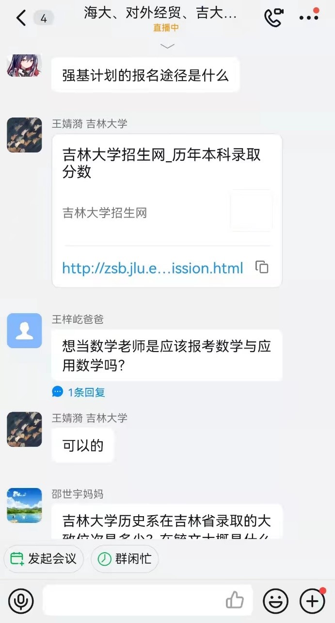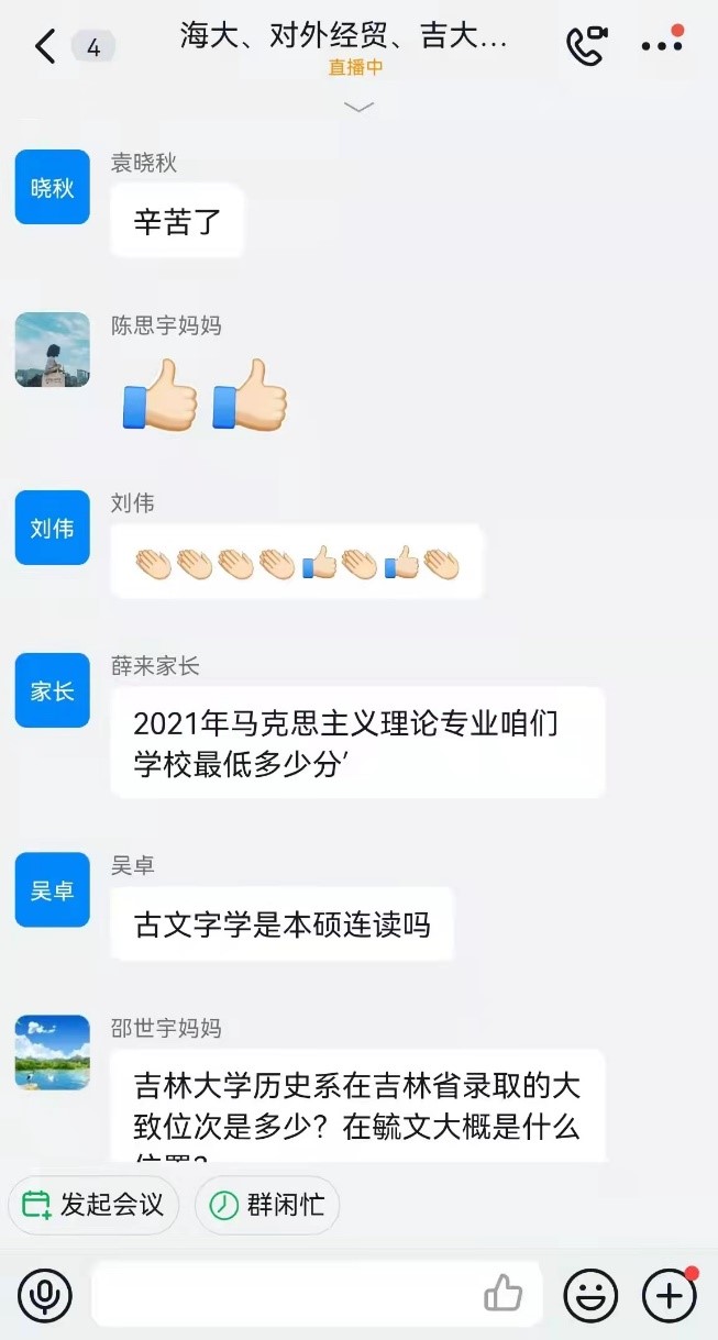 直播结束后,家长和学生们热情不减,接连提出了许多问题。团队成员针对这些问题在宣讲群里逐一进行了解答。其中一位家长,他的孩子对于吉大法学心仪已久,十分期望未来能够进入肉视频