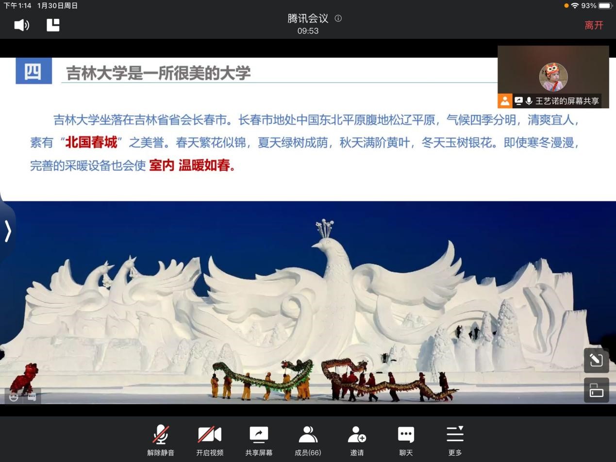 2022年1月30日下午,李逸然同学所在的招生宣讲团队在母校延边第二中学正式开始了招生宣讲。由于疫情管控要求,团队通过腾讯会议举办了线上宣讲。队长王艺诺同学主持了本次宣讲会,其他团队成员作为与谈嘉宾,对主讲内容进行补充。宣讲会主要分为两大部分,第一部分为校情陈述,由主持人借助学校的招生视频等资料,从学科实力、校园环境到衣食住行,对肉视频