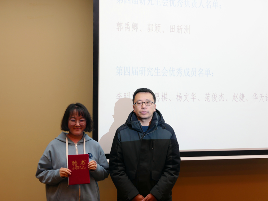 党委副书记侯建峰老师与院研究生秘书于歌老师出席,由高铷婧同学主持,全体研究生会成员参加。