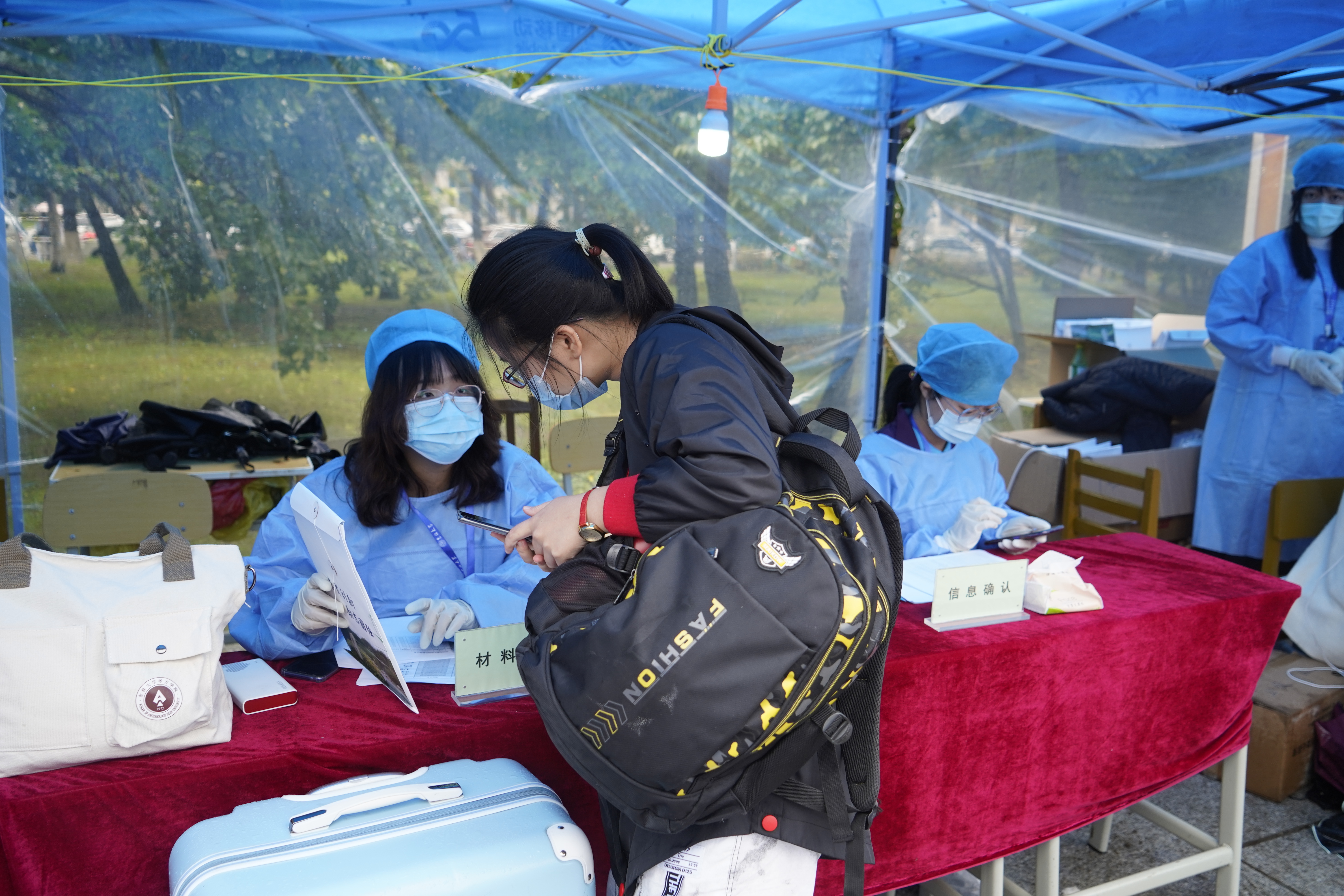 清晨秋风习习,裹挟着阵阵秋雨,给五月花广场平添了几分寒意,但这丝毫未曾影响现场的热烈气氛,辅导员助理和志愿者们仍以最饱满的热情认真整理迎新物资,有序布置迎新场地。上午6时,场地布置工作全部完成,现场全体师生准备就绪,期待良久的迎新工作正式开始!随着新生们陆续前来报到,迎新工作也如火如荼地开展起来。辅导员助理们细致核实每一位新生的信息,帮助新生完成各项报到手续,并逐一发放新生材料包。期间,辅导员马嘉男老师亲切询问新生来校方式与家庭情况,并贴心叮嘱加强自我防疫保护、增添衣物预防感冒等。随后,新生们由负责对接的志愿者引领前往宿舍。一路上志愿者们主动为新生们搬运行李,详细解疑答惑,帮助新生们尽快熟悉校园。在新生报到的整个流程中,每一个环节都有师兄师姐们的指导和陪同,他们亲切的态度和热情的帮助,很快就拉近了彼此之间的距离,让新同学在全新的环境中感受到了关爱与温暖。