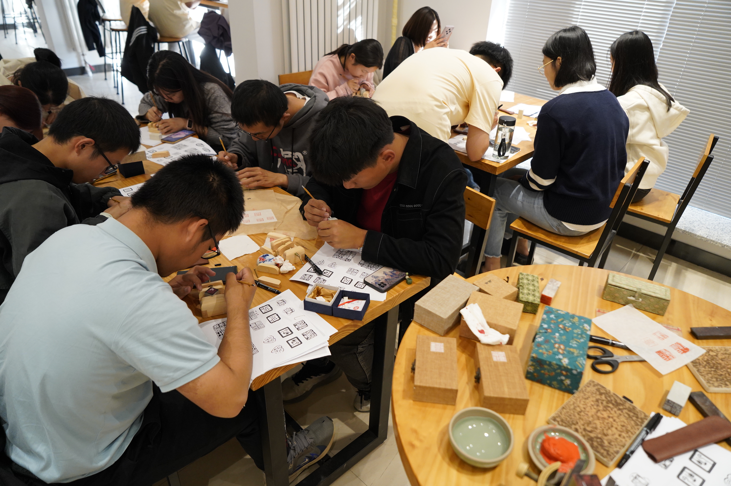 随后,郭同学进行篆刻技艺现场教学,并指导示范,让每位参与者深刻体会到篆刻艺术的魅力。在掌握了基础的篆刻技能后,同学们开始挑选祝福祖国繁荣昌盛的篆刻内容,沉浸式体验篆刻技艺。经过一番精心雕琢,同学们完成了各自的篆刻作品,将其印在卷轴之上,尽情表达着对祖国母亲的深切热爱。