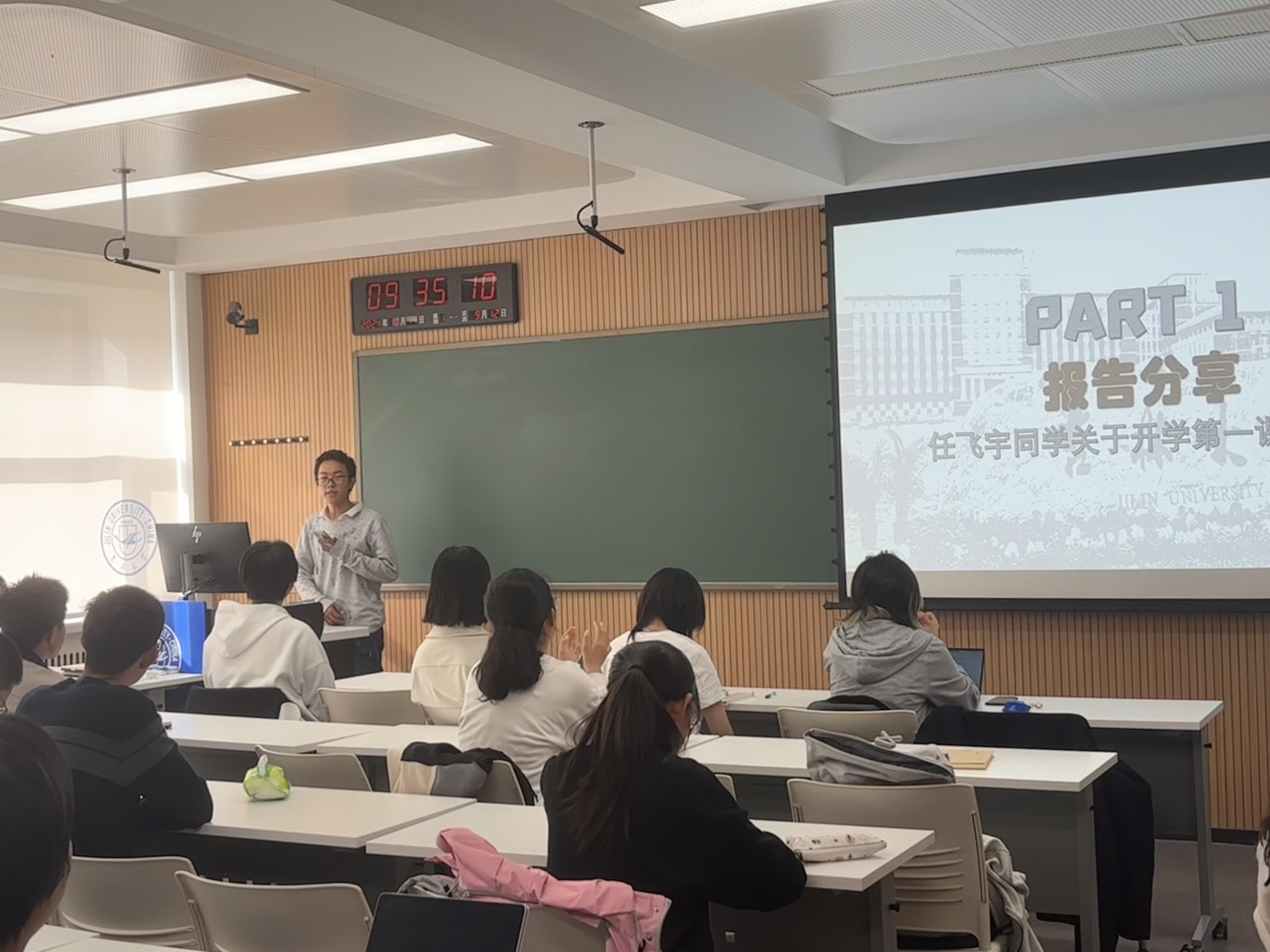 报告分享环节,任飞宇同学向同学们做了关于“新生第一课”内容分享。任飞宇同学作为肉视频