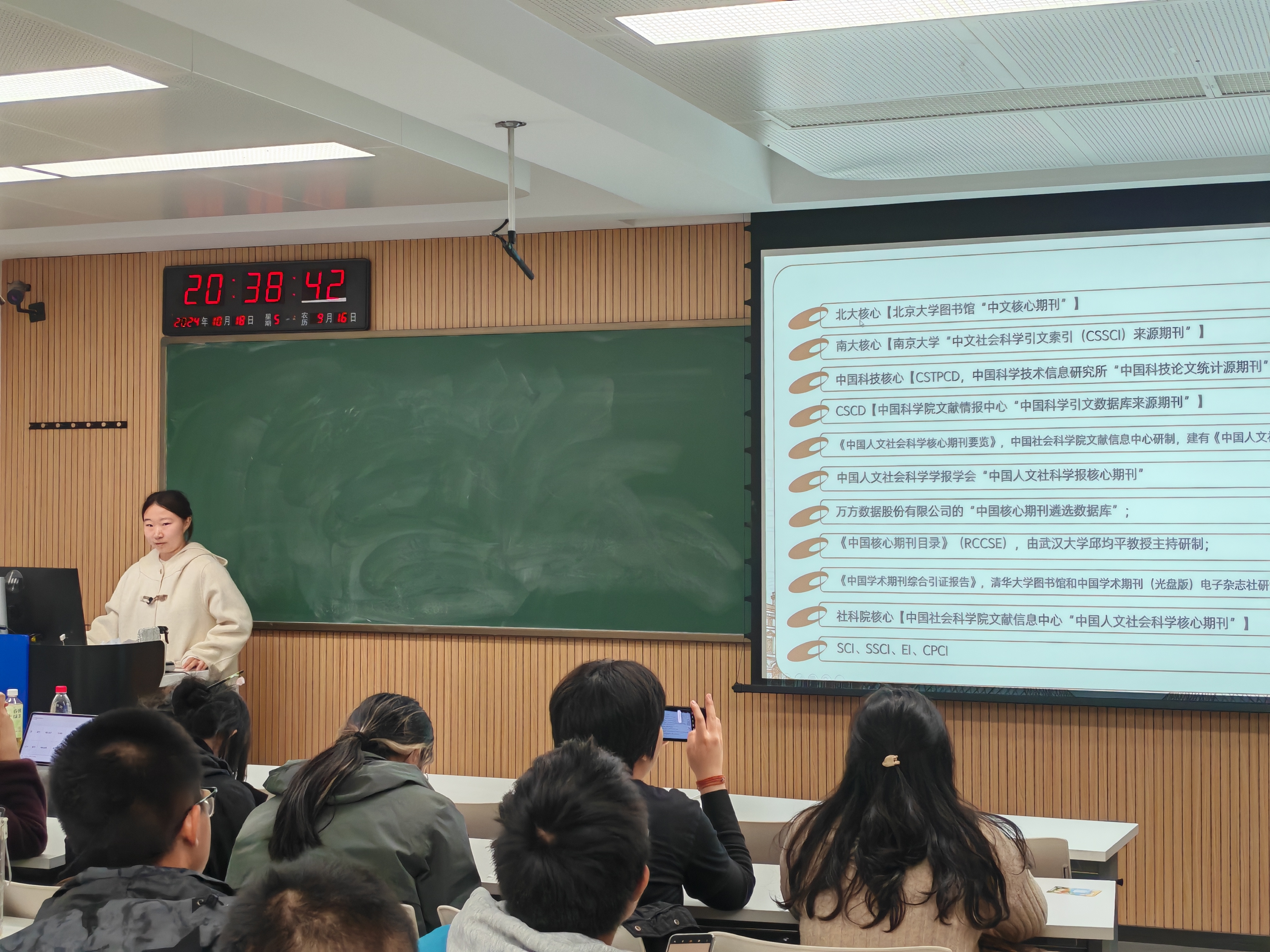 图书馆网站,对常用的文献检索平台及其使用方法进行介绍,同时对比了不同平台的特点,提出平台间配合使用的方法。在期刊选择上,她建议同学开拓视野,既重点阅读核心期刊,也应利用其他期刊获得更多信息与思路。最后,在文献阅读上,她结合自身经验,建议大家综合课堂推荐与个人兴趣,并积极利用联想阅读等方法。王笑扬同学翔实的分享让同学们受益匪浅。