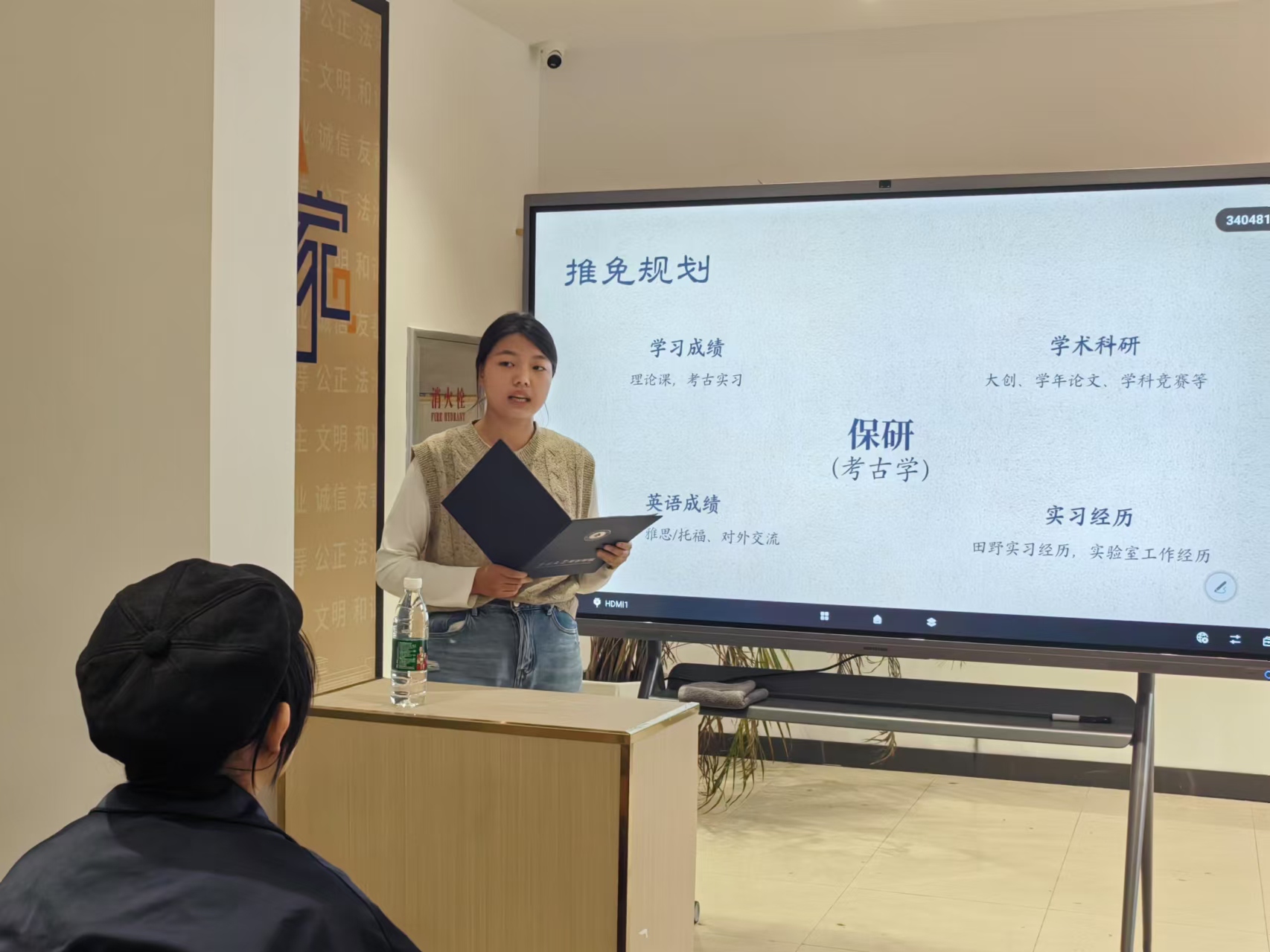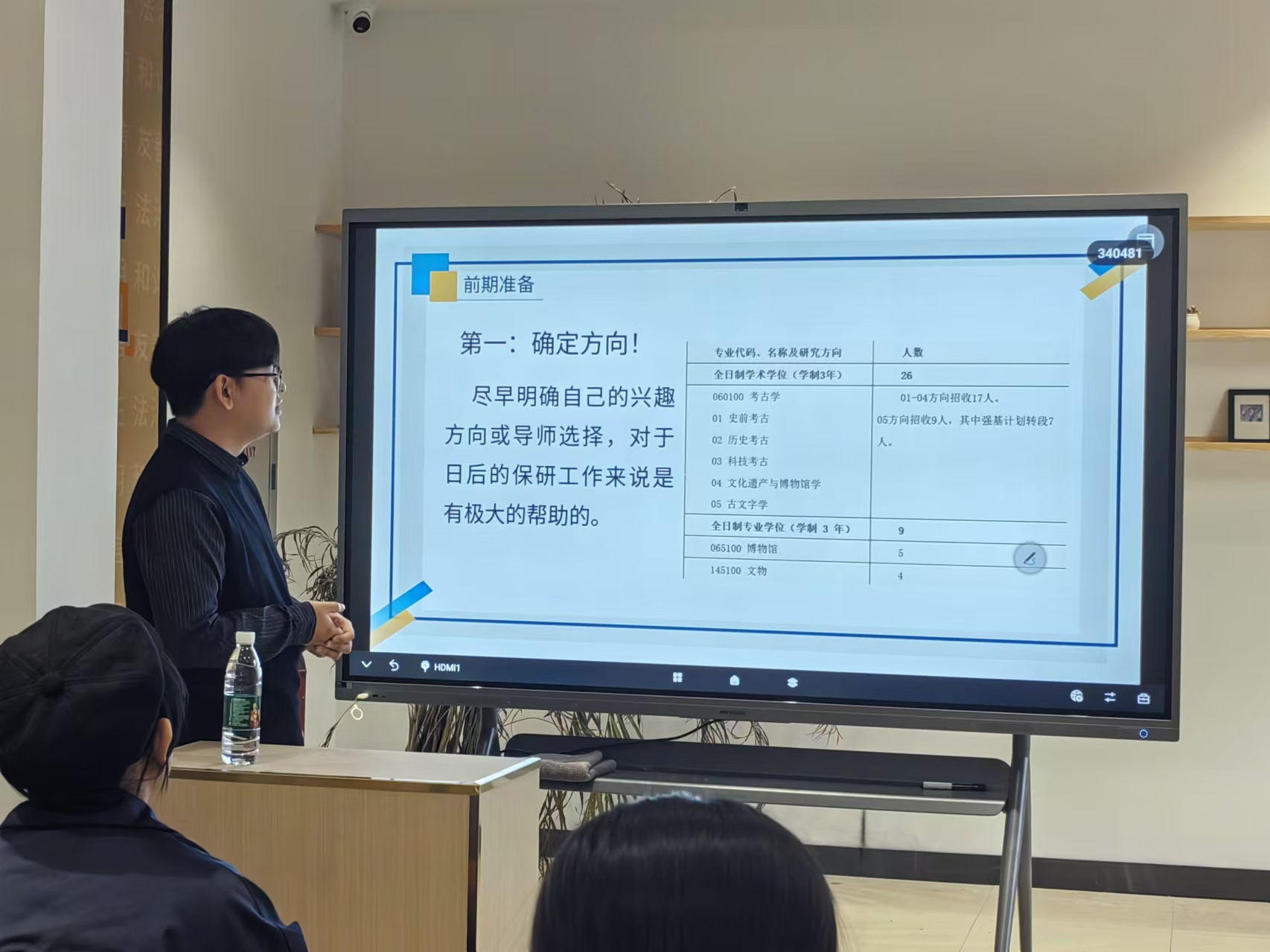 副院长方启老师莅临现场进行专业指导,2021级考古学专业赵梦竹、禹明岐,文物与博物馆学专业车佳南、孔闻晗,古文字学专业李盈玉进行保研分享。