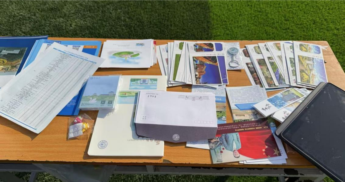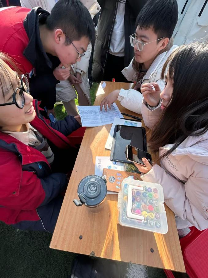 入校后,队员们按校方要求在操场布置场地,2022级王亚祺和2023级姚宜丰负责基础答疑与人员分流,其余成员按专业分组,为分流后的学生提供进一步专业解答。