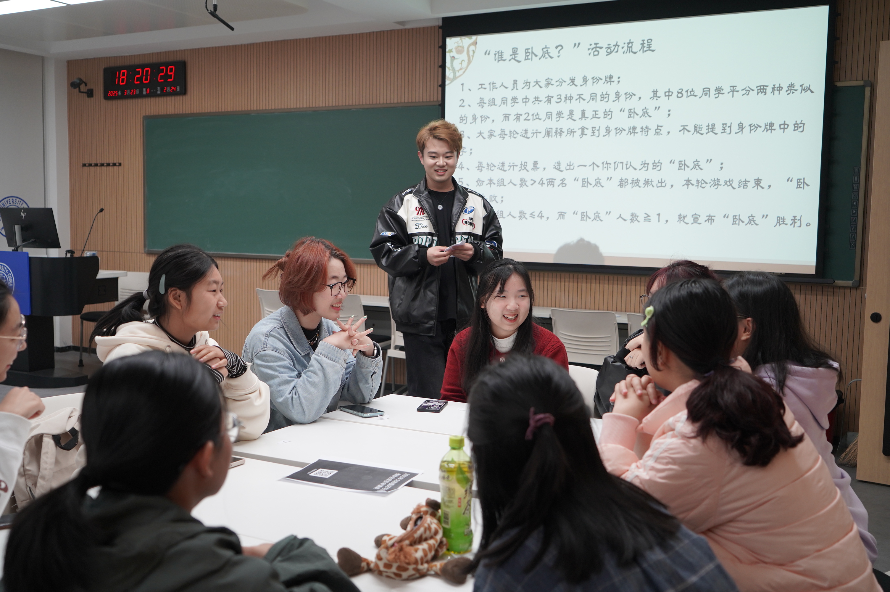 在许琼方的介绍后,大家按照所坐位置分三组进行游戏,协会成员们提前为大家设计好了吉大考古专属版“谁是卧底”词语和“海龟汤”,每组词语都采撷了大家校园生活和专业学习的吉光片羽。在一轮轮猜测推理中,分组围坐的大家从最初的拘束到后来的开怀大笑,尽情享受游戏带来的快乐;掌声与欢笑叠出,将教室内的气氛推向了高潮。
