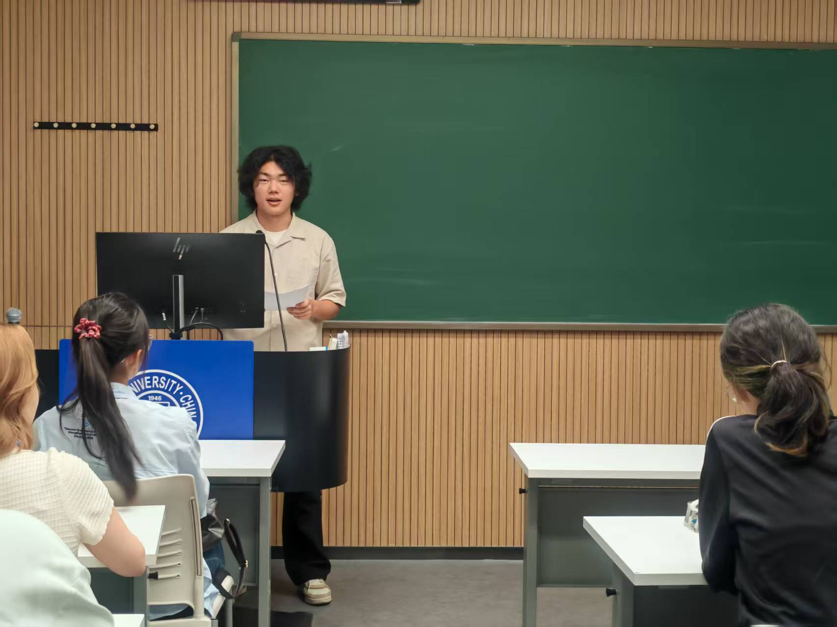 陶马俊同学首先进行分享。在课业学习方面,他提出学习应“技近乎道”,不囿于琐碎知识点与分数得失,课前预习、课堂学习与课后复习三位一体,相辅相成。除了个人学习,他还谈到个人学术发展,鼓励大家敏而好学、上下求索,秉持自由独立的学术精神,既要研读经典著作,也要关注学科前沿。最后,他提醒大家要重视兴趣培养,让自发动力推动学习与研究。