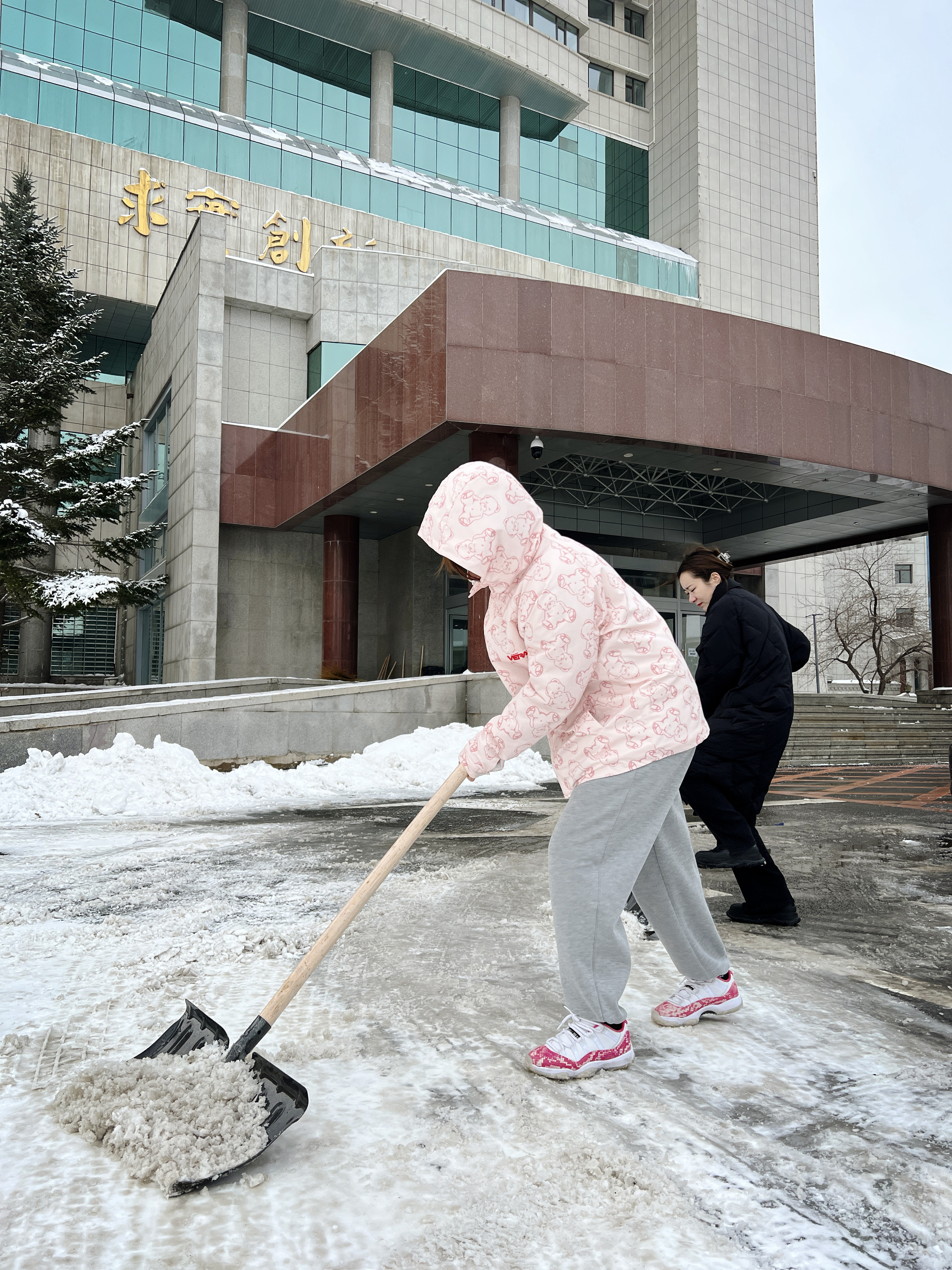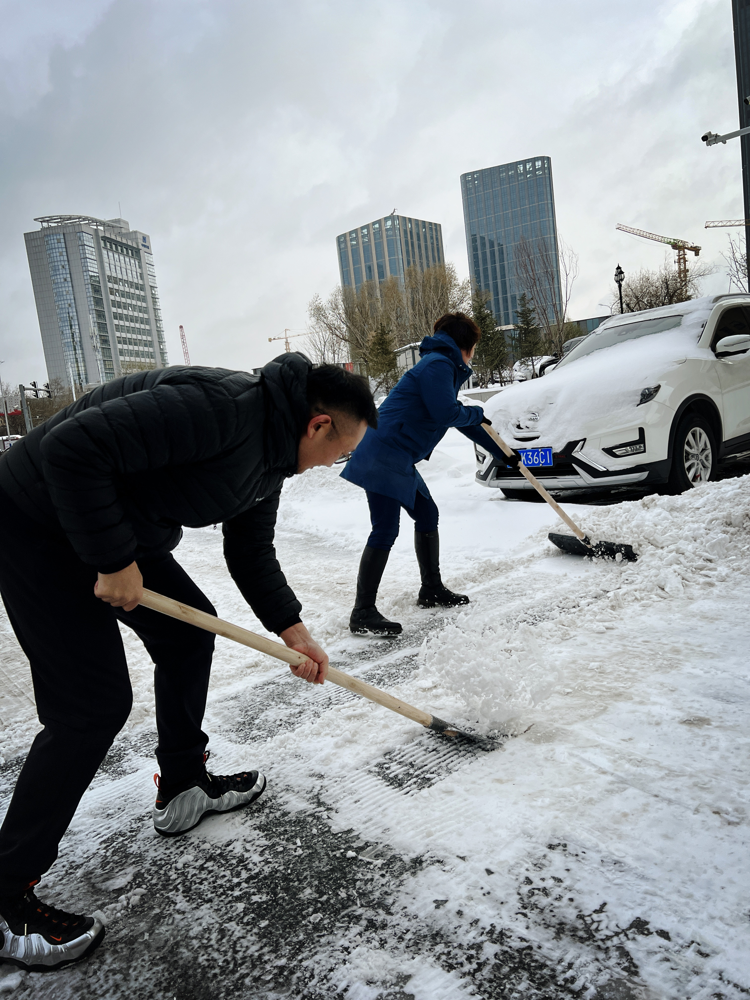 党员们在观测了楼前路面情况后,决定将清雪重点放在停车场出车路线,抄起锹铲干了起来。
