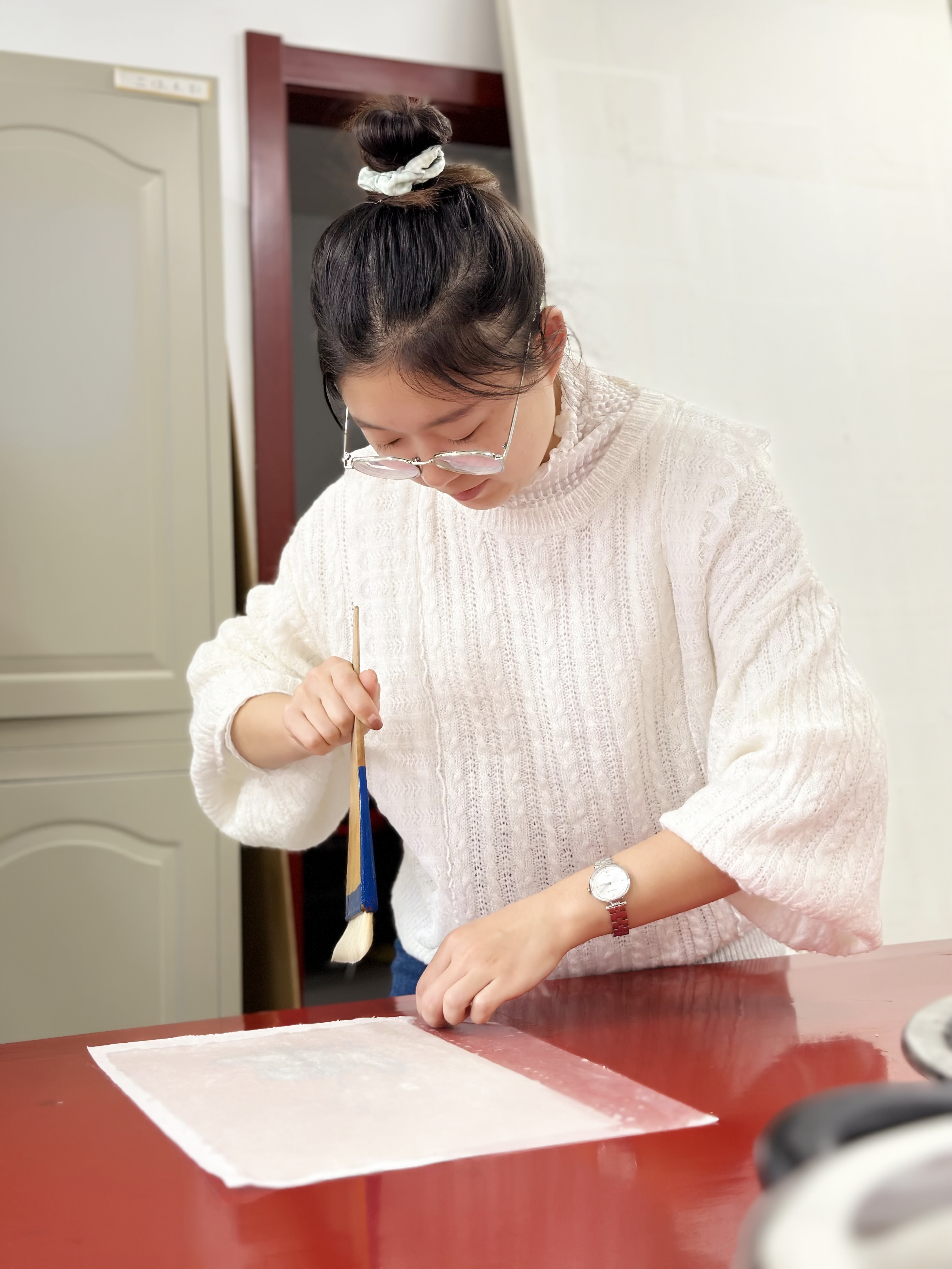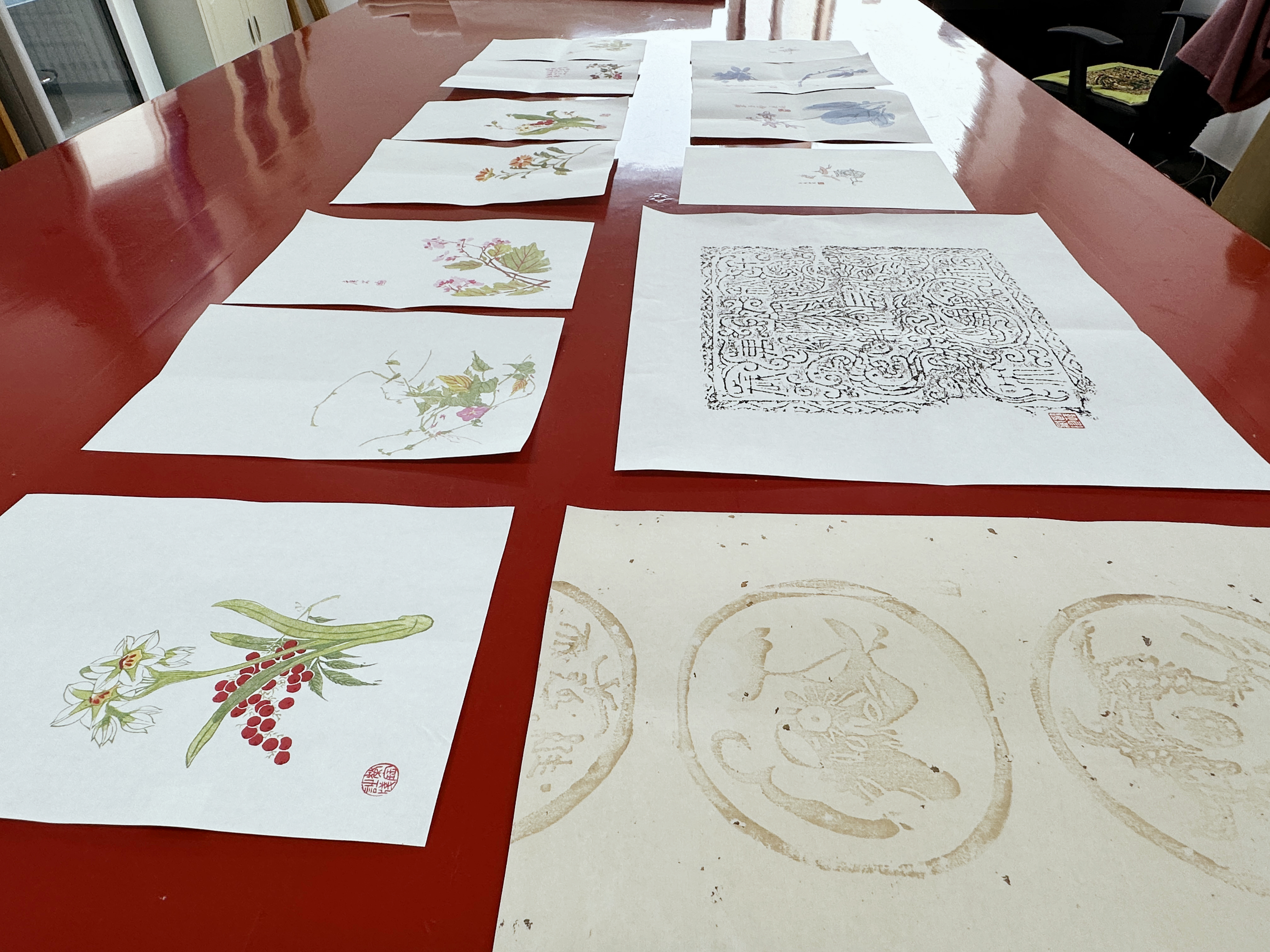 有的人在刷浆时出现褶皱惊慌失措手忙脚乱,有的人气定神闲有板有眼。姜晓东不时地指导纠错。围观的拍照摄像交流心得。第二天,看到完全晾干剪裁好后的花笺排放在装裱案上,老师们学习后的喜悦溢满心胸。
