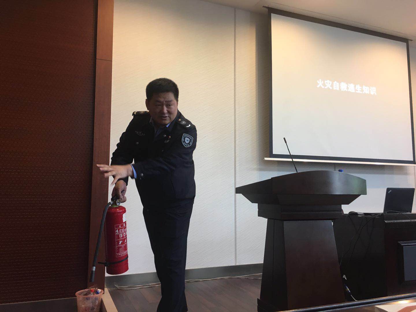 董立明首先结合近几年发生的校园火灾安全事故指出消防安全工作的严峻性,为大家敲响了警钟,强调消防安全重在预防。然后分别对办公室、家庭、学生宿舍这三个场所的消防安全隐患进行了详细介绍,告诫大家消防安全无小事。最后通过一段火灾自救逃生视频,讲解了火灾发生时的逃生技巧与注意事项。