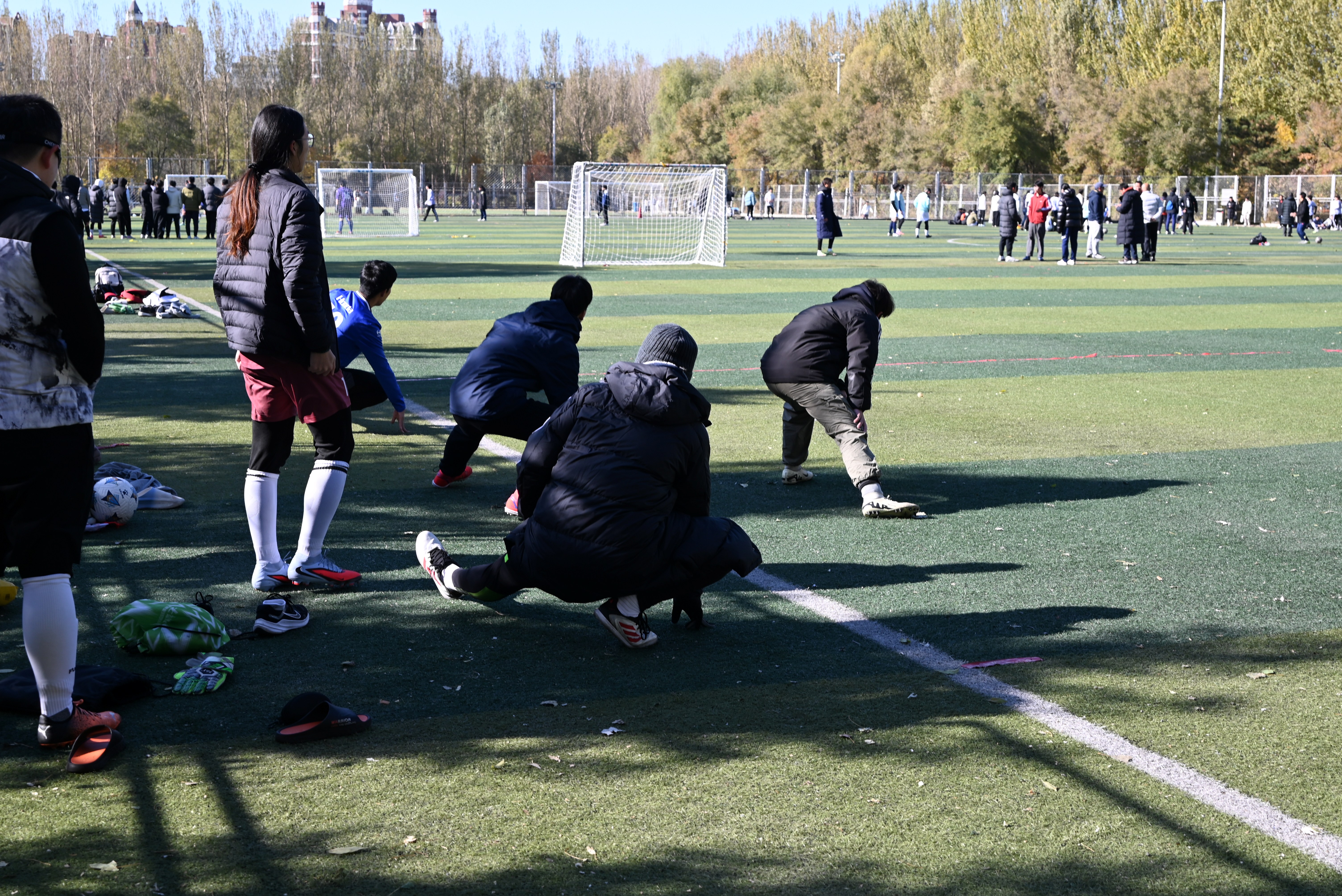 时值深秋,寒意渐浓。为确保在激烈的比赛中发挥出最佳状态,队员们统一身着队服,佩戴专业护具,有条不紊地进行赛前最后的热身准备。